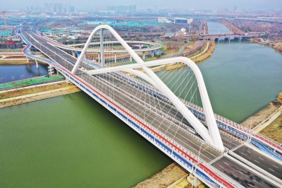 南部新城承天大道项目附属的秦淮湾大桥是一座下承式空间多索面异型系杆拱桥,桥宽42米,拱最高46米,主跨157米,双向6车道。建成后,对于缓解卡子门、双桥门立交拥堵,改善主城东南部路网,推动新城建设具有重要意义。 (李琦 王昊 摄)