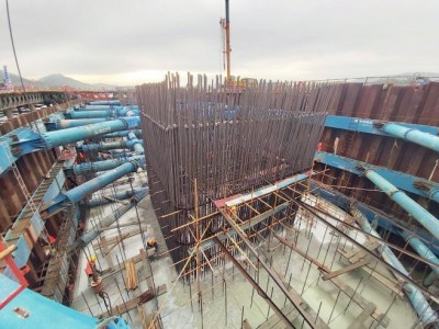 西津郁江特大桥为双塔组合斜拉桥,桥梁全长1190米,为全线控制性工程。其13#主墩塔高143米,2.5米长桩基22根,承台采用C30混凝土分两次浇筑完成。 (张旺胜)