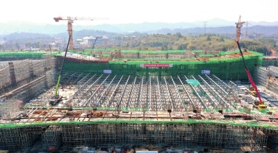 项目建设工期不到一年,时间紧迫、任务艰巨。承建该工程的中铁四局市政公司和钢结构建筑公司,调集精兵强将,上足施工机械,以“高起点谋划、高标准建设、高质量管理、高效率推进”为目标,精心组织施工。2022年春节期间坚持生产不松懈,节后迅速开展“大干100天”劳动竞赛活动,现场始终保持千余施工人员。