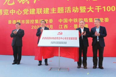本报景德镇讯 3月11日,“千年瓷都党旗红 六稳六保争先锋”党建联建主题活动暨大干100天劳动竞赛推进会,在中铁四局景德镇国际陶瓷博览交易中心项目部举行。景德镇市委书记刘锋,景德镇市人大常委会党组副书记、副主任、市委秘书长罗建国,景德镇市国资运营投资控股集团公司(以下简称“景德镇国控”)党委书记、董事长余笑兵,总经理胡景平,中铁四局党委书记、董事长刘勃,副总经理姜喆等领导出席活动。