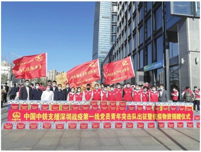 本报深圳讯 3月9日,中国中铁支援深圳战疫第一线党员青年突击队出征仪式在中国中铁华南区域总部(中铁南方)举行。共青团深圳市委书记高大伟、中国中铁华南区域总部(中铁南方)党委书记、董事长赵勇出席仪式,并为党员青年突击队授旗。中铁四局20名党员、团员组成的青年抗疫突击队在列。