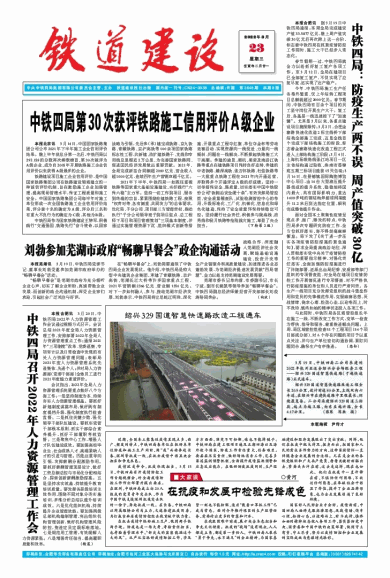 (上接第1版)坚持提升履约能力水平,以“完美履约”为导向,推动项目管理提档升级,按照“核心团队稳定、相关经验丰富、关键人才配足”的原则及“首件先行、样板引路”的要求,科学管理、精细施工,高质量、高标准、高层次建设好各项铁路工程,并建立工程质量分级分区回访机制,全面提升客户满意度,树立了良好的品牌形象。2021年下半年,中铁四局在哈尔滨铁路局、成都铁路局、皖赣铁路安徽公司、昌九城际铁路公司等考核评比中均位列第一名。