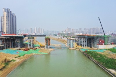 引江济淮新建青龙桥全长814米,道路标准宽42米,拟建为城市主干道路,设计时速50公里。其主桥为独塔斜拉桥长220米,采用钢混混合梁,跨径组合为(140+80)米,其中钢箱梁顶推段总长128.9米,钢箱梁顶板全宽42米,总重量达500吨。 (张跟平 华新平)